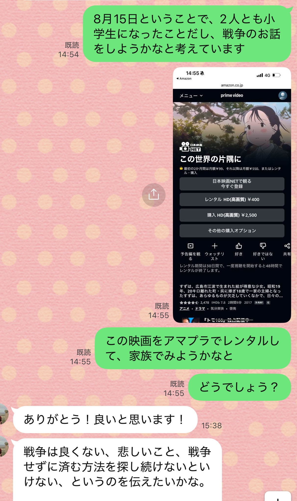 家族でこの映画を観ることをきかっけに、娘たちと戦争と平和について考える時間をつくる予定です。